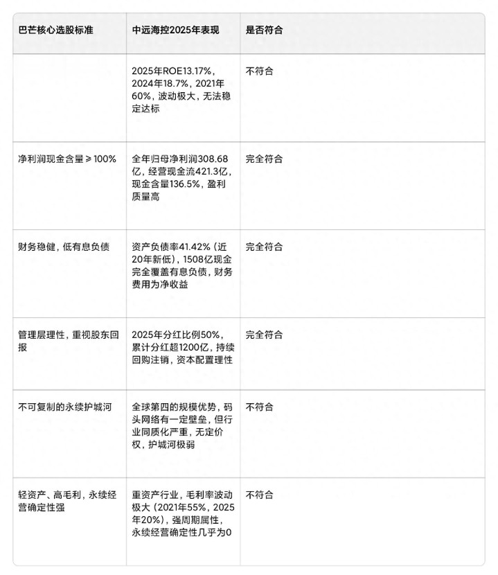 我把巴芒的核心选股标准,和中远海控2025年的表现,做了一个清晰的对比表格,大家一眼就能看懂: