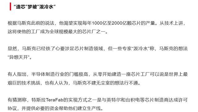 如果从成本来说来说,2纳米的制程,还是世界最大的生产线,并且还是在美国,按照台积电一条2纳米生产线,在已经有成熟经验的情况下也要百亿美元的投资来看,那么马斯克的这个项目落地,成本可能会达到千亿美元。